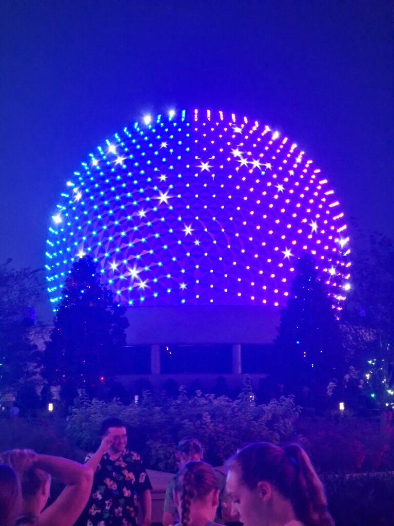 On finira en se baladant jusqu’à la boule pour voir les illuminations. Une photo (encore lol) et on repart vers les Skyliner juste avant le départ de Luminous. Nous ne restons pas pour le voir car nous sommes fatigués.