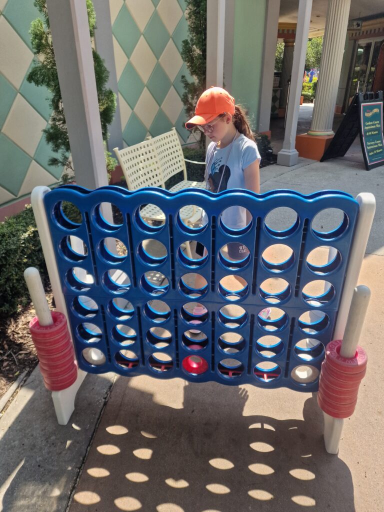 Pour patienter, il y a des puissances 4 géant, je fais plusieurs parties avec les enfants. Adeline est prise de maux de tête et se fait mordre sur le ventre par une fourmi rouge.