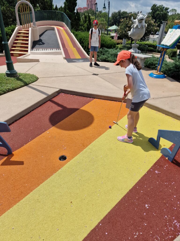 Nous avions décidé que ce matin nous allions faire le mini golf au Disney’s Fantasia gardens. Celui-ci se trouve au pied de l’hôtel Swan.