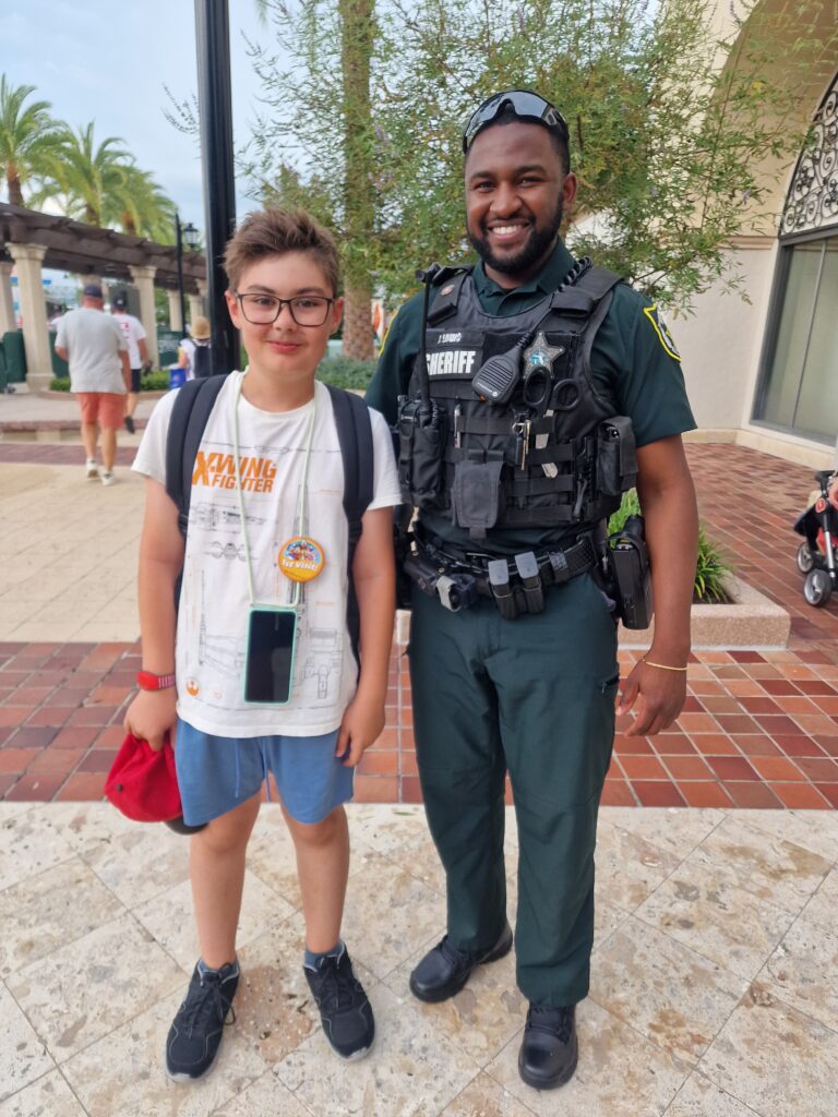 On flânera dans Disney Springs puis nous ressortirons prendre le bus pour retourner à l’hôtel afin de se reposer. Au passage, Ewan voit un policier local mais n’ose pas demander pour faire une photo. Le gars a une tête sympa, je lui demande, et accepte sans soucis. Ewan est intimidé mais content.