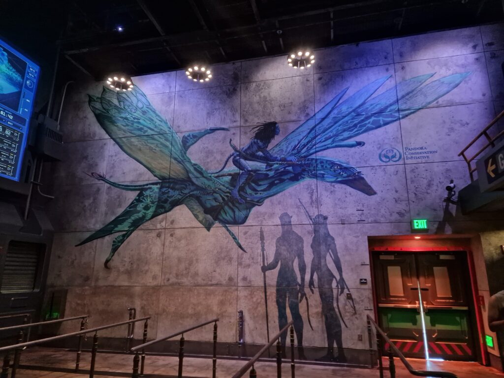 Dès qu’on passe l’arche de l’entrée de l’attraction avec le temps d’attente, c’est 60 min. La file d’attente est juste incroyable et tellement immersive. C’est beau pour les yeux et les oreilles, on y est ! Nous sommes dans Pandora!